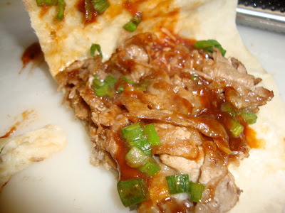 I took some of the meat and green onions from the egg rolls and placed them in a tortilla with barbecue sauce, then grilled it in the pan with the fat and oil from the meat. This was better than the egg roll because the peppery barbecue sauce complemented the shabu-shabu meat better than the sweet chili sauce. I don't think I will ever make the egg rolls again, but I could see myself making another quesadilla with this ribeye meat. SANDWICH