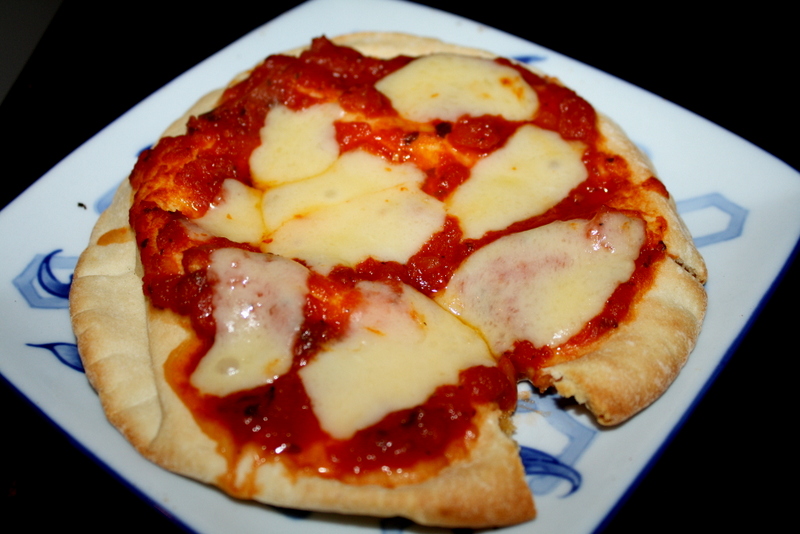 There was one Trader Joe's pita bread left so I made I myself a pita bread pizza with "Jersey Tomato Sauce." I have no idea what that means, but it was on sale at the store one day when I needed tomato sauce (and it was basil flavored). It was a good snack.